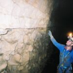 La question qu’on se pose dans ce laminoir, en plus de savoir quand va s’arrêter ce ramping infernale, c’est dans quel sens a bien pu circuler l’eau. En effet, c’est toute l’histoire de la grotte qui en dépend. Si l’eau s’engouffrait dans cette étroiture, il s’agissait d’une perte (l’eau se « perd »). A l’inverse, si l’eau ressortait par là, on a affaire à une résurgence (l’eau « surgit »). Pour le savoir il faut lire certains indices écrits sur les parois : figures de dissolution par exemple. Or au Crochet, on n’en a trouvé que dans la rivière (11) mais pas à l’entrée. Il faut alors se reporter à l’histoire du réseau karstique entier, et à l’histoire du Jura, pour percer le mystère. Une hypothèse avancée par les géologues suggère que l’entrée aurait pu être un trop-plein latéral du réseau (résurgence). Les indices d’écoulement sont encore à trouver !