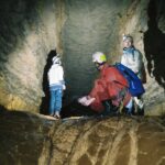 L’entrée de la cavité, située à flanc de coteau, est bien discrète. Il faut pénétrer dans un étroit boyau qui se transforme très vite en laminoir sur une trentaine de mètres (1). Le courant d’air bien marqué a permis aux inventeurs de la grotte de trouver le courage pour désobstruer toute cette longueur ! On pénètre en réalité entre deux strates de calcaire (deux couches), quasi-horizontales (on dit « subhorizontales »). C’est d’ailleurs la définition spéléologique du laminoir : passage « large » mais bas entre deux couches de calcaire. L’eau a creusé ce passage en se faufilant dans le joint de strate, dans la discontinuité de roche située entre deux couches successives.