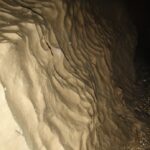 Ensuite, il faut éclairer la paroi d’en face (4). On observe une figure très intéressante. La stratification (succession des couches) change brusquement d’orientation. En terme géologique, c’est ce qu’on appelle une stratification oblique ou entrecroisée. Pour en trouver l’explication, il faut remonter à l’époque des dinosaures et se placer à l’origine de la formation du calcaire (figure ci-dessous).