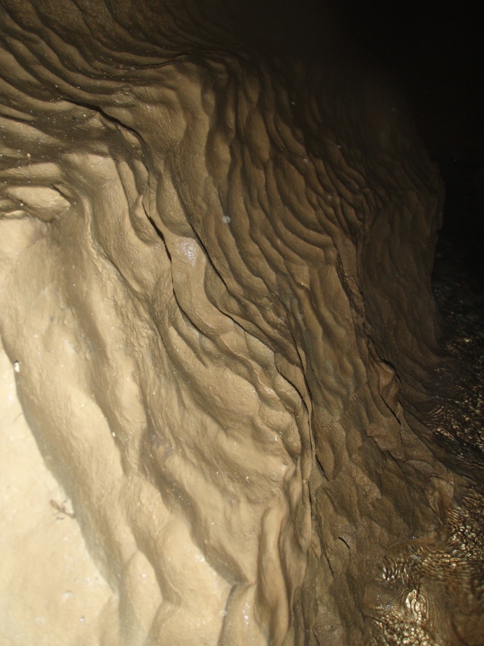 Le calcaire du Crochet sup appartient certes à une même unité géologique (le Bajocien supérieur), il n’empêche que sous terre il se présente sous des formes très différentes. Selon le climat, le relief et les conditions biologiques, deux strates adjacentes peuvent avoir des formes complètement différentes. A l’entrée et sur une dizaine de mètres d’épaisseur, ce sont les calcaires oolithiques. Les oolithes ne sont pas des bêtes, mais des petits grains de sable qui ont été enrobés d’une couche de calcite, de calcaire cristallisé par précipitation. A l’œil nu, on les distingue à peine. Sur les parois, l’aspect est granuleux et rugueux. C’est ce calcaire qui offre à nos yeux les magnifiques figures obliques et entrecroisées expliquées plus haut.