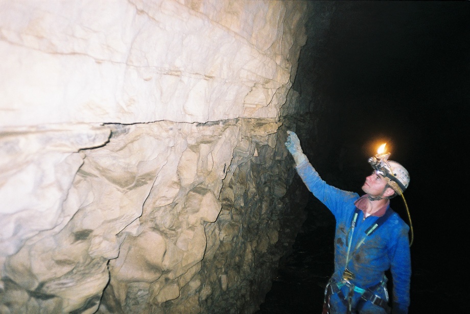 La question qu’on se pose dans ce laminoir, en plus de savoir quand va s’arrêter ce ramping infernale, c’est dans quel sens a bien pu circuler l’eau. En effet, c’est toute l’histoire de la grotte qui en dépend. Si l’eau s’engouffrait dans cette étroiture, il s’agissait d’une perte (l’eau se « perd »). A l’inverse, si l’eau ressortait par là, on a affaire à une résurgence (l’eau « surgit »). Pour le savoir il faut lire certains indices écrits sur les parois : figures de dissolution par exemple. Or au Crochet, on n’en a trouvé que dans la rivière (11) mais pas à l’entrée. Il faut alors se reporter à l’histoire du réseau karstique entier, et à l’histoire du Jura, pour percer le mystère. Une hypothèse avancée par les géologues suggère que l’entrée aurait pu être un trop-plein latéral du réseau (résurgence). Les indices d’écoulement sont encore à trouver !