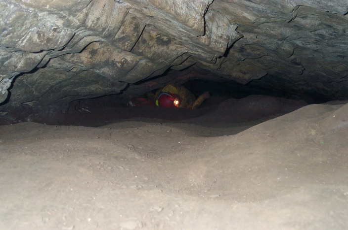 - Photo B – galerie avant le P12. Sa forme trapézoïdale est typique des galeries creusées dans un joint subhorizontal