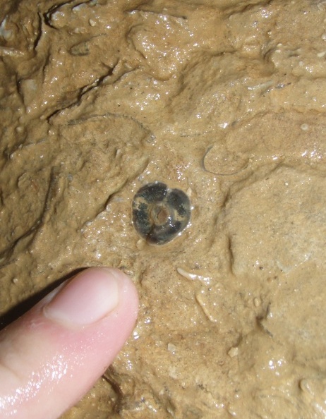 Plus on s’enfonce dans la grotte et plus on remonte le temps. Aux calcaires oolithiques précèdent des passages marneux (calcaire + argile) reconnaissables à leur couleur plus sombre et à la dissolution plus difficile : les strates dépassent en paroi. Par alternance, on observe également des niveaux constitués de petits morceaux de coquillages. Ce sont les lumachelles à petites huîtres, des comblements d’anciens récifs et canaux par des débris de coquillages (les huîtres). Imaginez les Bahamas actuelles, vous aurez un aperçu de l’Ain il y a 160 millions d’années ! On les repère très bien car le grain est très grossier. A l’intérieur de ces strates, on observe de magnifiques fossiles. Nous en citerons deux : les bélemnites et les crinoïdes. Les premiers sont des animaux marins qui ressemblent à nos seiches actuelles. Leur fossile est le rostre, partie dure de l’organisme en forme de balle de fusil. On en trouve des sections et parfois des morceaux entiers sur les parois du Crochet. Les seconds, les crinoïdes, sont des animaux ressemblant à des algues sous-marines. On retrouve le plus souvent des morceaux de leur tige – les articles – qui peuvent avoir des formes très variées. Les plus beaux sont en forme d’étoile à 5 branches. Au Crochet, le courant marin devait être important car on rencontre très rarement plusieurs articles encore alignés : ils ont été dispersés à la mort de l’animal.
